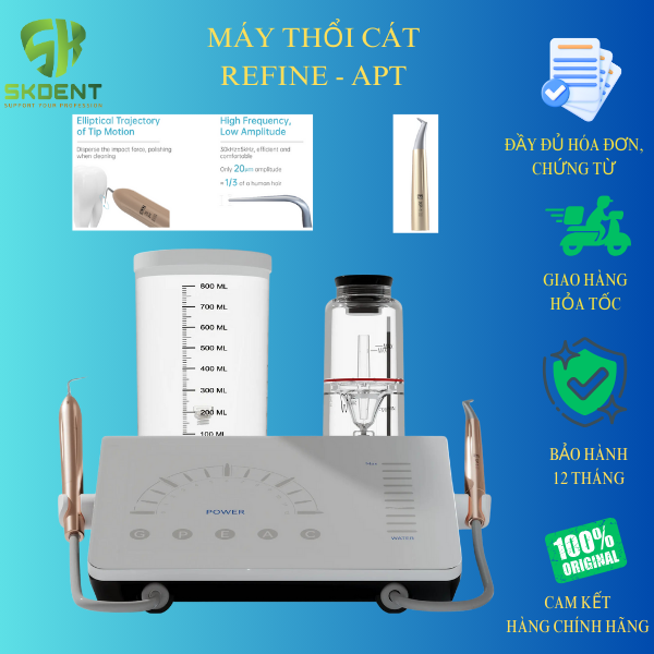 Máy thổi cát nha khoa Refine APT là thiết bị tiên tiến kết hợp giữa chức năng cạo vôi siêu âm và đánh bóng bằng khí nén, mang lại giải pháp toàn diện cho việc điều trị nha khoa. Sản phẩm được thiết kế để tự động chuyển đổi giữa các chế độ làm việc dựa trên tay cầm được sử dụng, giúp nha sĩ dễ dàng thực hiện các quy trình điều trị khác nhau.