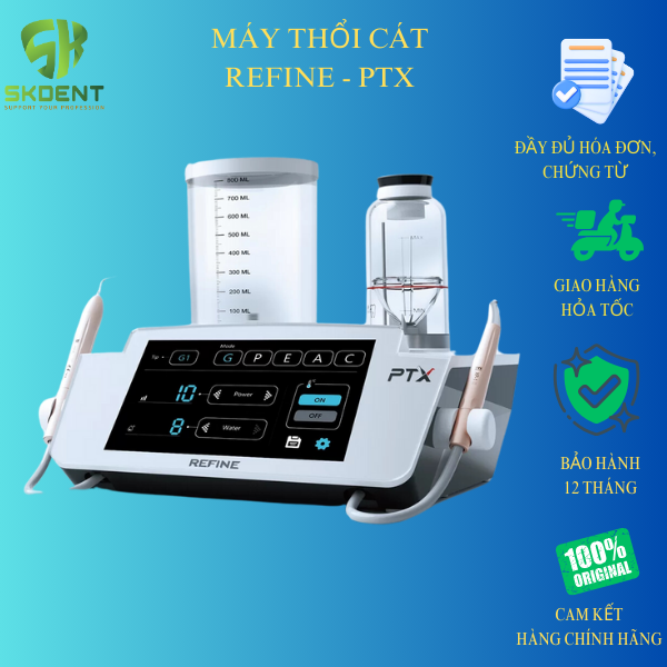 Máy thổi cát nha khoa Refine PTX là thiết bị tiên tiến kết hợp giữa chức năng cạo vôi siêu âm và đánh bóng bằng khí nén, mang lại giải pháp toàn diện cho việc điều trị nha khoa. Sản phẩm được thiết kế để tự động chuyển đổi giữa các chế độ làm việc dựa trên tay cầm được sử dụng, giúp nha sĩ dễ dàng thực hiện các quy trình điều trị khác nhau.
