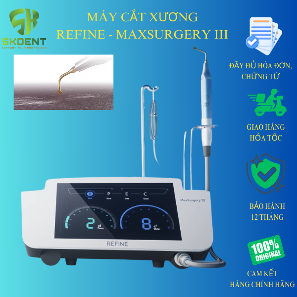 Máy cắt xương nha khoa Refine MaxSurgery III là thiết bị tiên tiến, được thiết kế đặc biệt cho các phẫu thuật nha khoa hiện đại. Sản phẩm này ứng dụng công nghệ siêu âm Piezo, mang lại độ chính xác cao và an toàn cho cả bác sĩ và bệnh nhân.