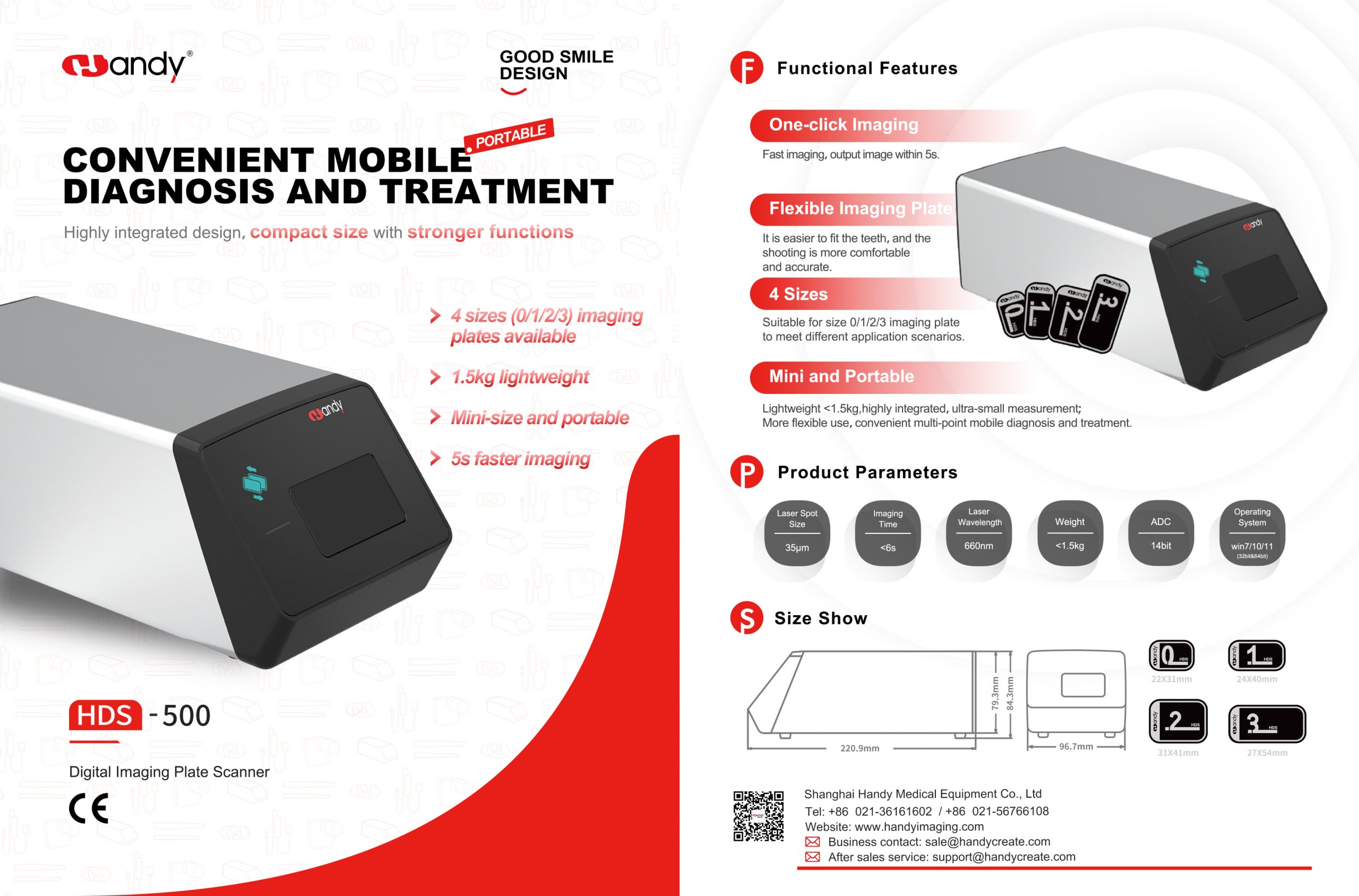 Máy quét phim nha khoa Handy HDS-500 là giải pháp lý tưởng cho các phòng khám muốn chuyển đổi từ phim X-quang truyền thống sang hình ảnh kỹ thuật số. Với tốc độ quét nhanh, chất lượng hình ảnh cao và thiết kế nhỏ gọn, HDS-500 giúp nâng cao hiệu quả chẩn đoán và mang lại trải nghiệm tốt nhất cho cả nha sĩ và bệnh nhân.