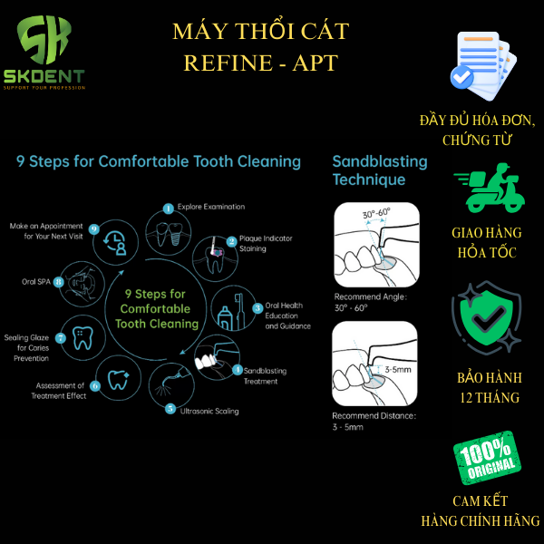 Máy thổi cát nha khoa Refine APT là giải pháp toàn diện cho các phòng khám nha khoa, giúp nâng cao hiệu quả điều trị và mang lại trải nghiệm tốt nhất cho bệnh nhân. Với thiết kế hiện đại và tính năng ưu việt, đây là sự đầu tư xứng đáng cho mọi nha sĩ chuyên nghiệp.